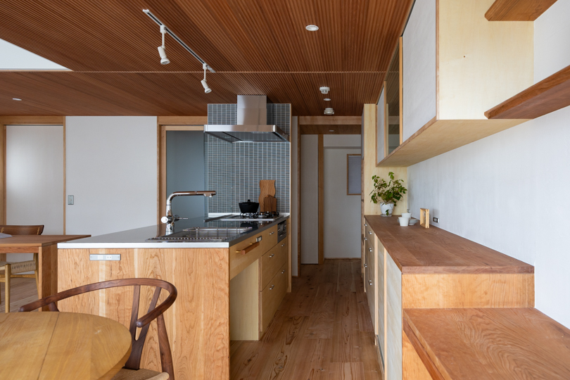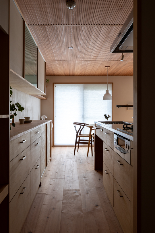 東側に配置したキッチンは、二人が並んで立てるゆとりあるスペースを確保し、回遊動線とした。