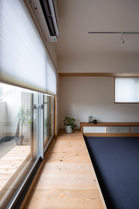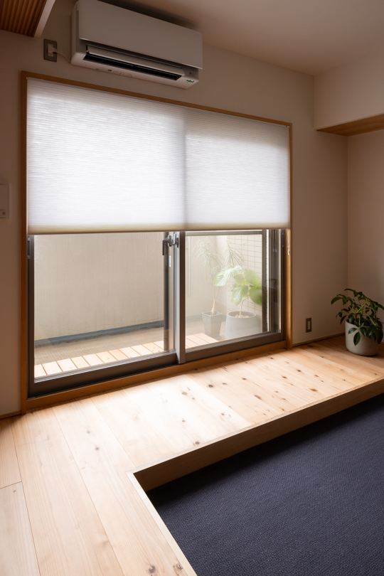 室内と外を繋ぐ中間領域として、バルコニーに簡易的なウッドデッキを設置。