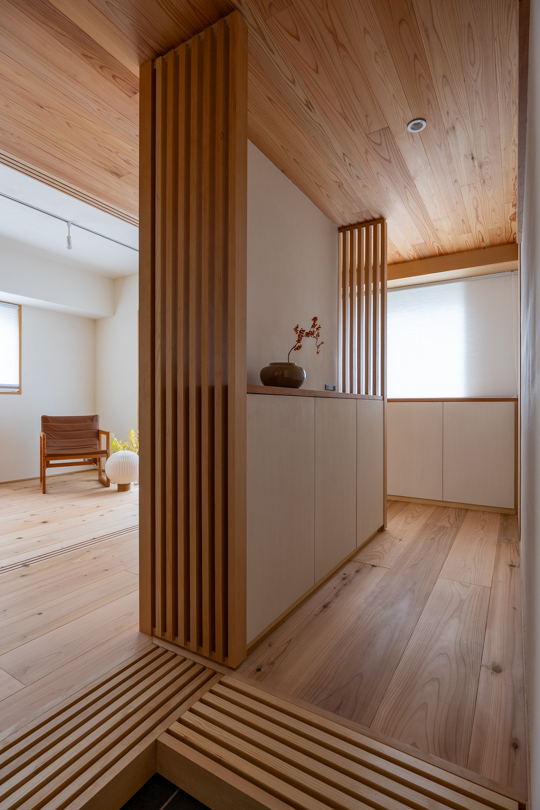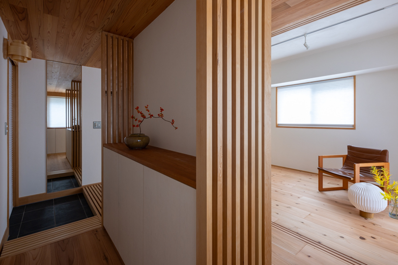 ルーバーやハニカムブラインド、造作カウンターを用いることで、玄関や廊下が「通過する場所」にとどまらず、室内空間としての質を高めている。