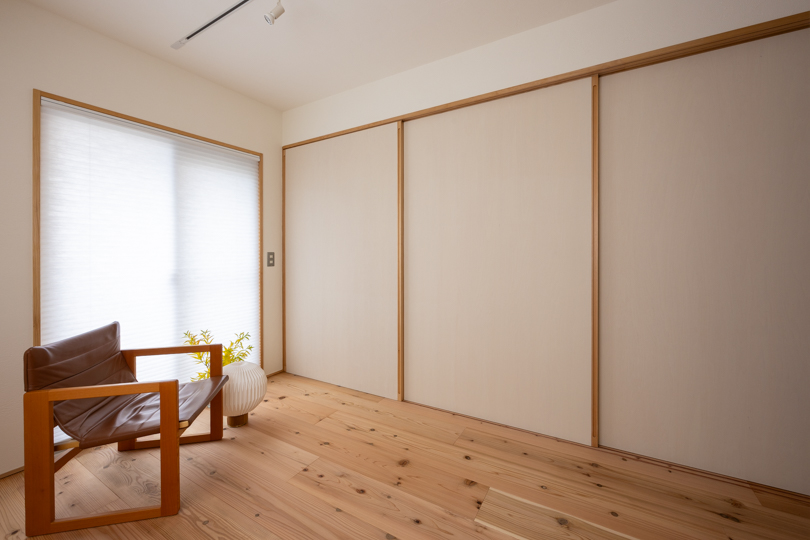 寝室は三枚の引き戸で仕切ることもでき、日中の開放感と就寝時のプライバシーを両立。