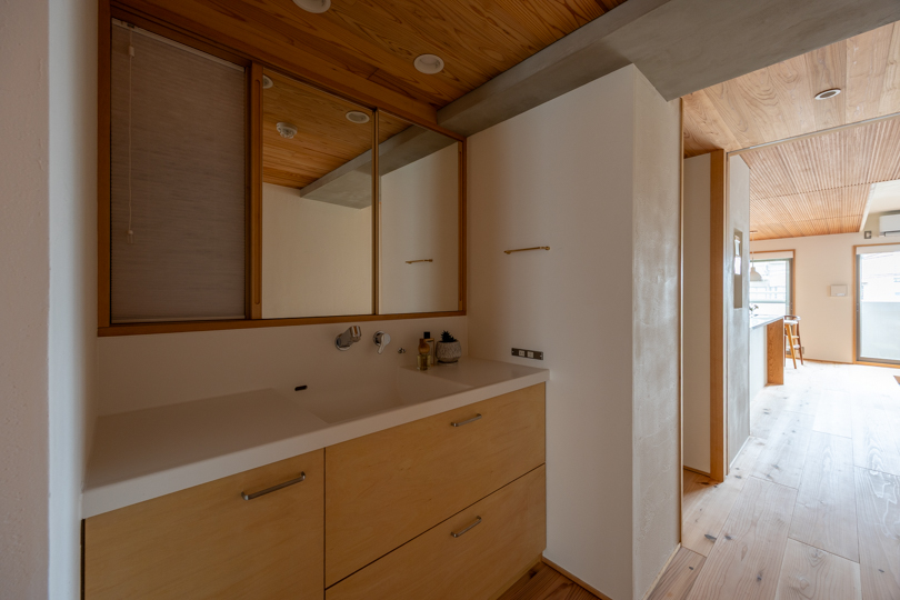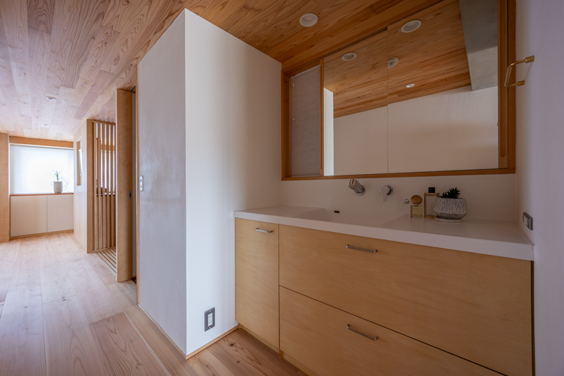 洗面コーナーは廊下に露出し、通路と洗面台に立つための空間を兼ねている。