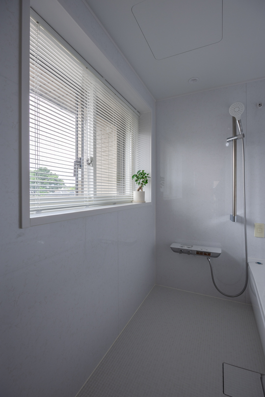 浴室からのブラインドの角度を調整することで、外からの視線を遮りつつ空を眺めることができる。