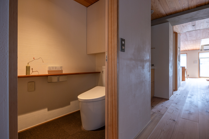 トイレ内の換気扇に木のルーバーを施すなど、細部まで大工の手仕事が光る。
